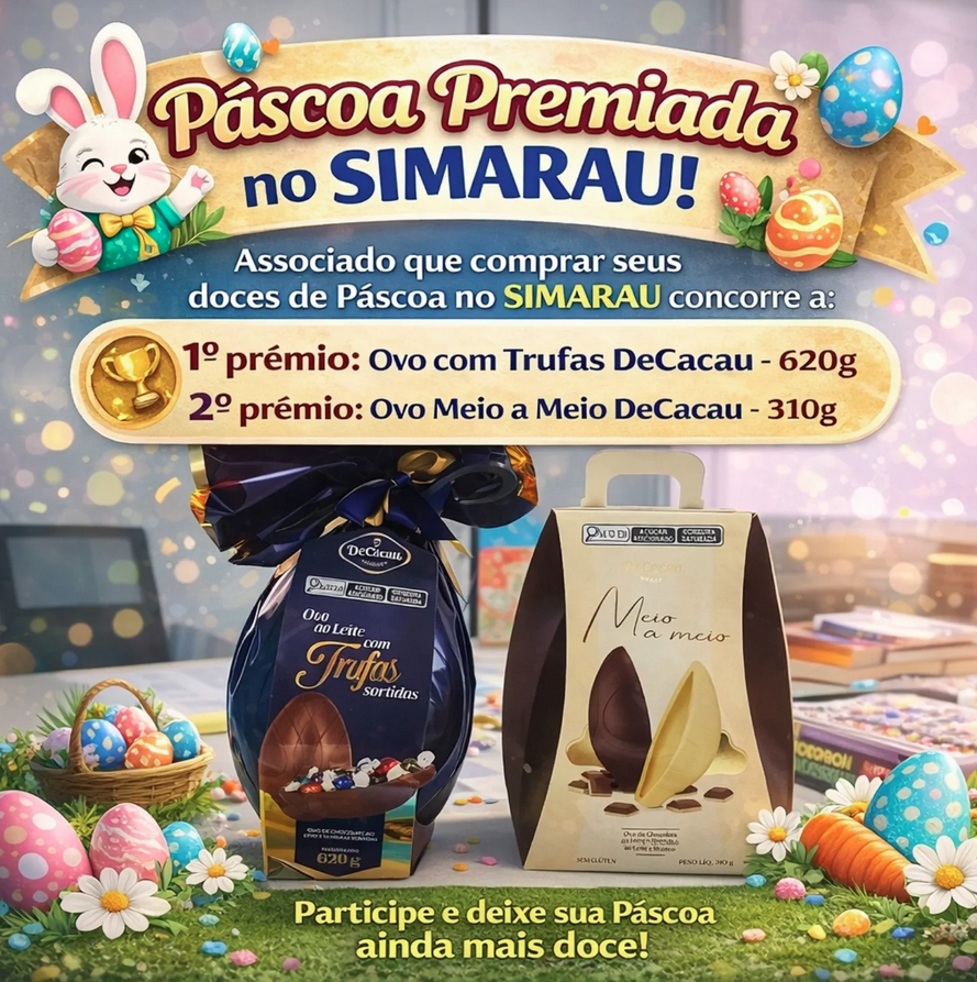 Notícias “Associado que comprar seus doces de Páscoa no SIMARAU concorre a prêmios especiais! 🐰🍫 1º sorteio: Ovo com Trufas De Cacau – 620g 2º sorteio: Ovo De Cacau Meio a Meio – 310g.” Promoção válida até 30/03/26.